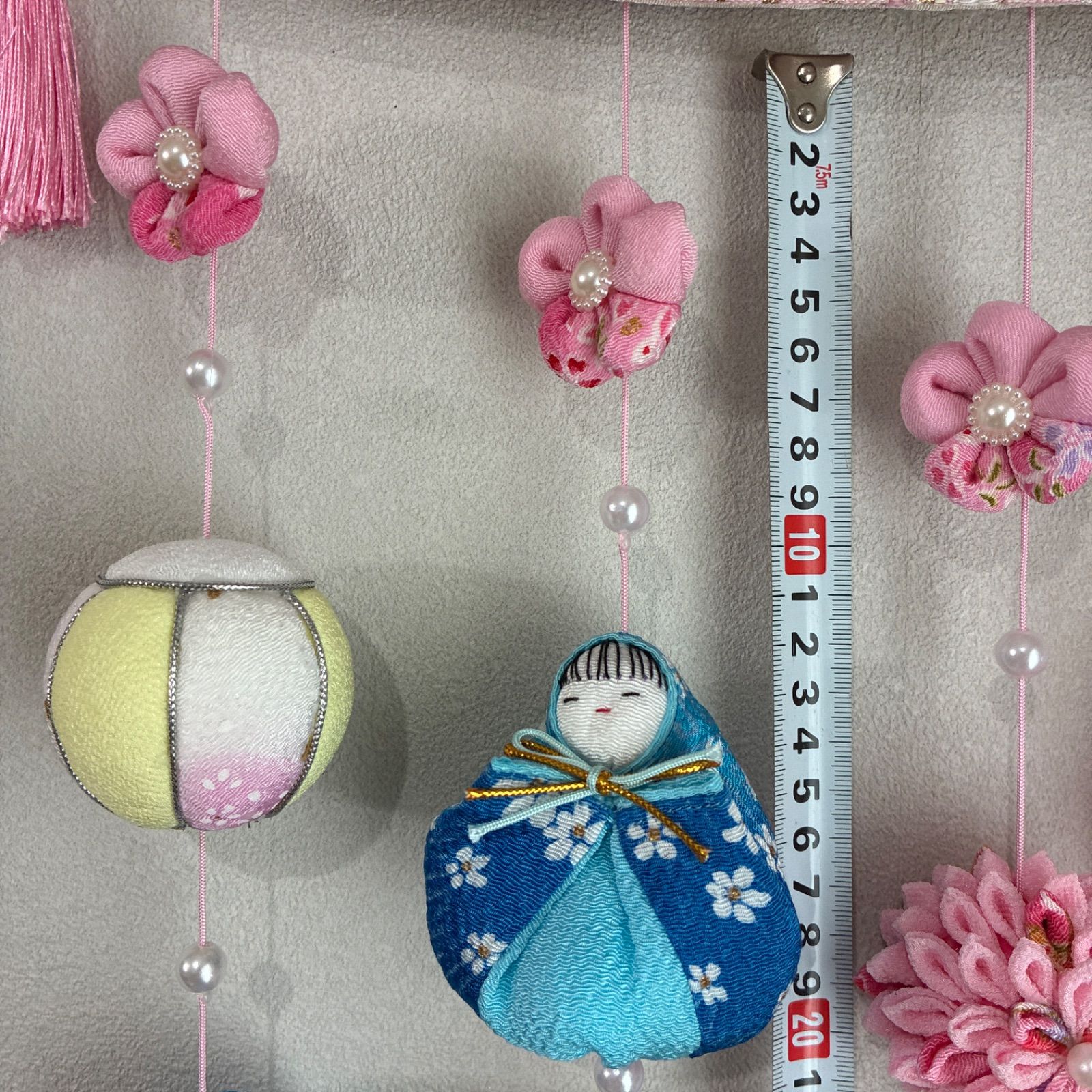 | 商品の特徴 | 503 吊るし雛 吊るし飾り ひな祭り さげもん 503 吊るし雛。503 吊るし雛 吊るし飾り ひな祭り さげもん。503 吊るし雛 吊るし飾り ひな祭り さげもん。503 吊るし雛 吊るし飾り ひな祭り さげもん 503 吊るし雛。お子様の健やかな成長を願い、心を込めて縫い上げました五つ桃 張子犬 鶴 はいこ人形 椿 姫だるま 座布団 三番叟 俵ねずみ 蛤袋 うさぎお手玉 紙風船 ハト みかん 烏帽子猿 唐辛子 おくるみ人形 桜 いちご 羽子板 三角✖️5 くくり花 ぼんぼり 七宝毱✖️2おおよそのサイズ全長 88センチ輪の直径 20センチ輪から下 70センチ中央の2個の七宝毱、ぼんぼりとタッセルの周りに25個の人形を5連にして飾りました主に古布の正絹を用いていますが、一部それ以外の生地も使用しています中央の七宝毱の下には特注のタッセルをつけました飾り台も収納箱もありません家にある空き箱での発送となります素人のハンドメイドですので、ご理解下さい尚、申し訳ありませんが値下げ交渉はお断りさせていただきます | ||